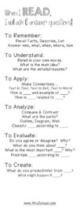 This is a Comprehension Strategies Bookmark that has comprehension strategies/skills on one side, and question starters that match Bloom’s Taxonomy levels on the other. Two copies will print per 8.5 x 11 sheet of card-stock. I laminate a class set at the beginning of the year. They are tall enough to fit in our student readers.