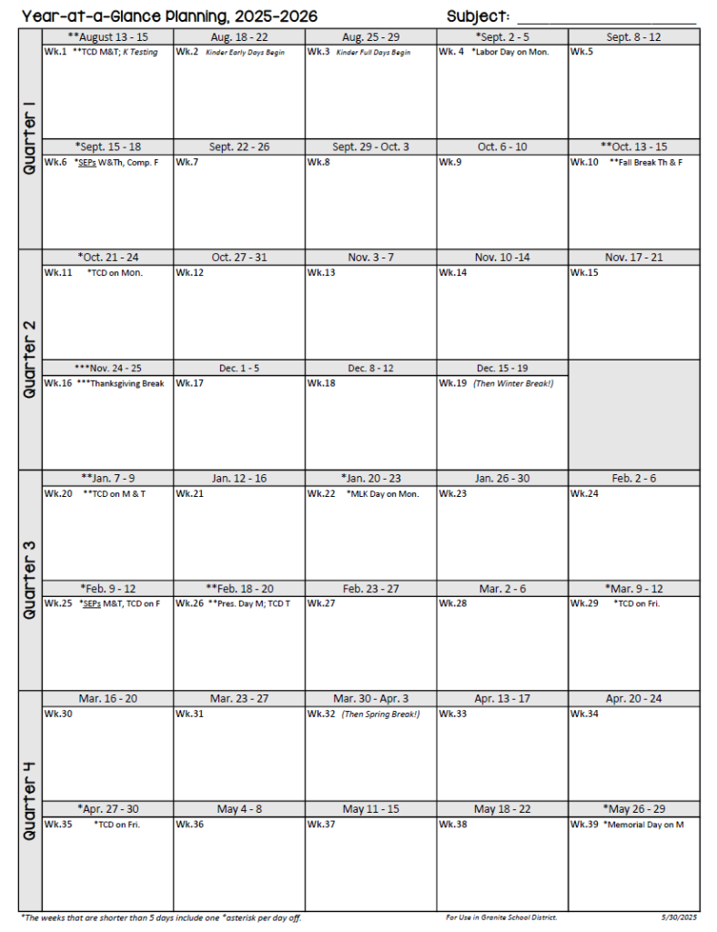 Every year I update this “Year-at-a-Glance Curriculum Mapping” page for the Granite District elementary calendar.